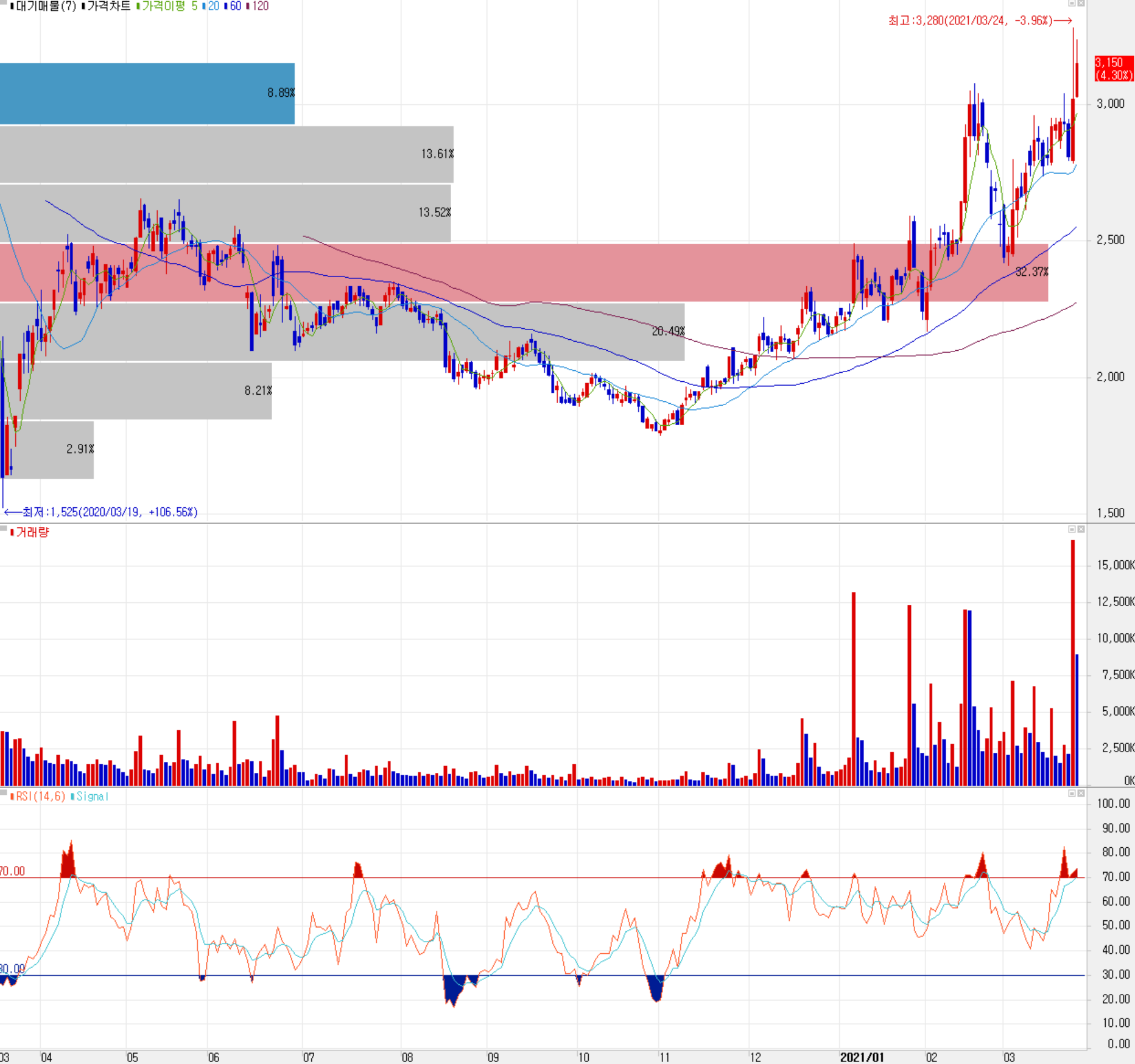 3월 25일 장종료 기준 당사의 주가는 3,150원으로 최근 가파른 상승을 보이고 있습니다. 외국인 비중은 1.98%이며, 시가총액 2,488억 원으로 코스닥 시총 상위 363위 종목입니다.