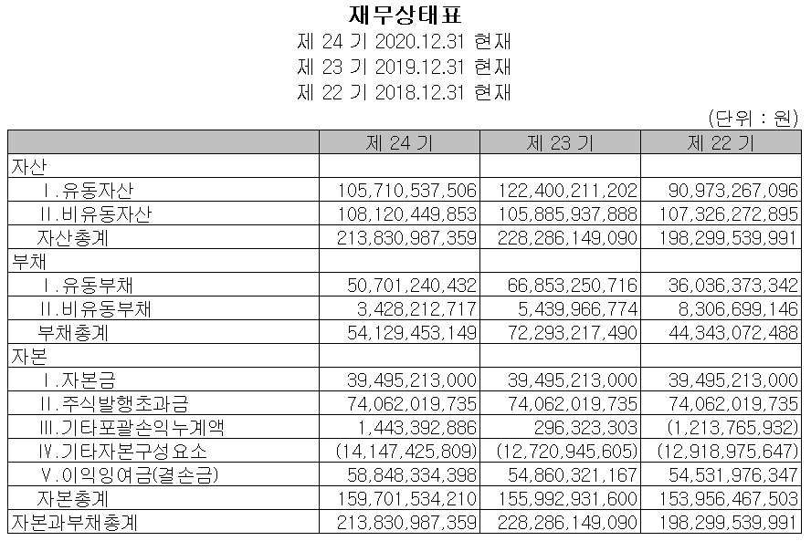당사의 지난 4년간 매출은 2,700억 ~ 2,800억 원에서 정체된 추이를 보이고 있으나, 지난 2년간 디스플레이 제조업체의 투자 지연 등에도 불구하고 적극적인 인수 합병 등으로 꾸준한 실적을 보이고 있습니다. 충당금 이슈와 부품 소재사업의 실적 부진이 4분기에 있었으나 꾸준한 영업 이익으로 현금이 창출되고 있으며, 이에 따른 투자활동이 이루어지고 있습니다. 부채비율도 38.45%로 점차 낮아지고 있으며, 유동 자산 1,057억 원, 유동 부채 507억 원으로 안정적 재무 상태를 유지하고 있습니다.