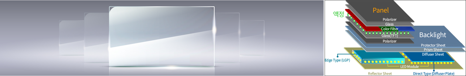 도광판이란 LED 광원을 면 전체에 균일하게 확산 시키는 부품으로써, 표면에 일정한 패턴을 인쇄하여 효율을 높여줍니다. 당사에서는 면광원으로 전환 시 BLU(Back Light Unit)의 휘도를 높이기 위하여 고투명도의 도광판을 생산하고 있습니다. 또한 당사가 생산하는 렌티큘라 소재의 패턴 도광판은 BLU 휘도 및 균일도를 업그레이드하였으며 기존 원료인 PMMA의 단점을 보완한 MS(Methylmetharcylate Styrene) 도광판을 개발, 생산 중에 있습니다. 이 제품은 Curved TV, Slim TV 및 Zero Bezel TV 등의 제조라인에 적용되고 있습니다.