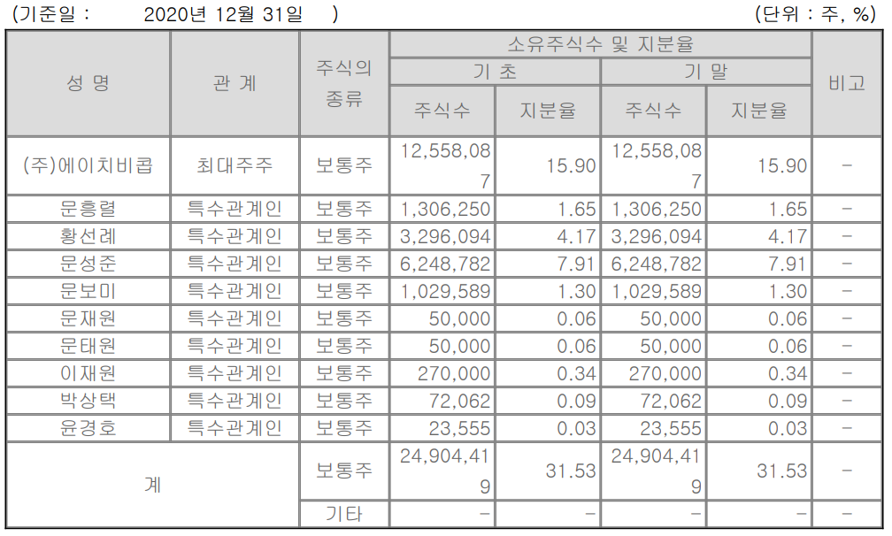 2020년 12월 31일 기준 당사의 최대 주주는 지배회사인 (주)에이치비콥 이며 당사의 지분 15.90%를 보유하고 있습니다. 기타 특수관계인 포함 31.53%의 지분을 확보하고 있습니다.