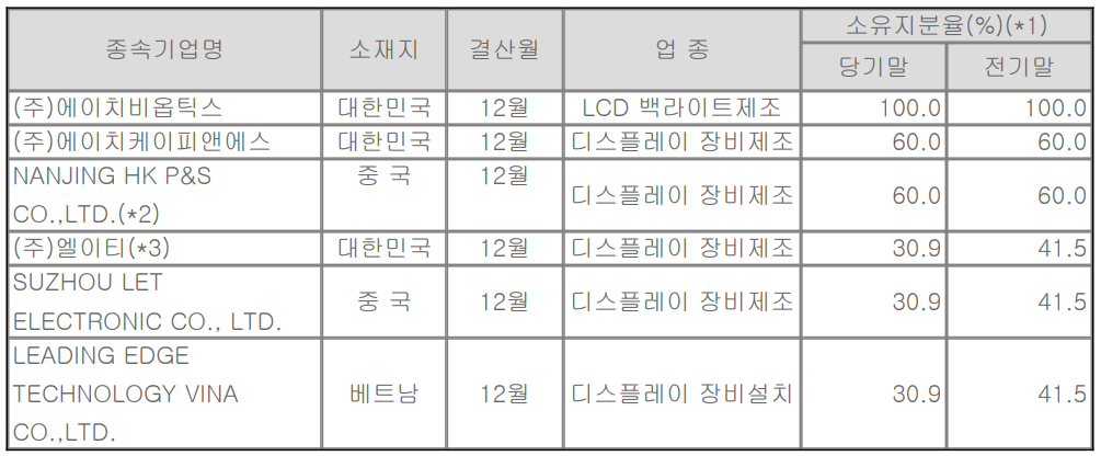 2020년 당기 말 현재 당사의 종속기업에는 중국 난징과 소주시, 베트남 등지에 해외 현지 법인이 있으며, LCD BLU를 제조하는 에이치옵틱스, 디스플레이 장비의 제조를 영위하는 에이치케이피앤에스 및 엘이티 등이 있습니다.