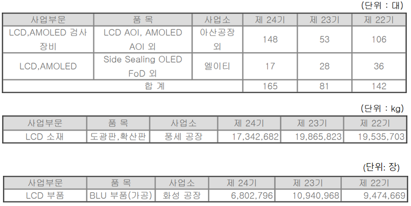 당사의 LCD, AMOLED 등 디스플레이 검사 장비의 제조는 아산공장과 종속회사인 엘이티를 통해 제작되며, 도광판과 확산판은 풍세 공장, LCD BLU 부품은 화성 공장에서 제조하고 있습니다.