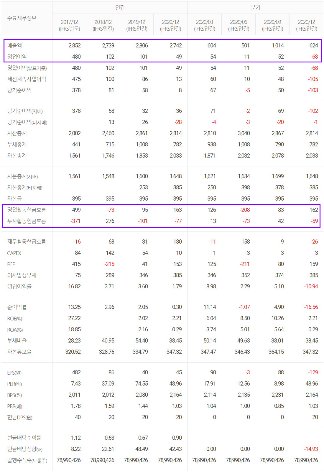 당사의 2020년 연매출 실적은 2,742억 원으로 전년 대비 2.25% 감소했고, 영업이익은 49억 원으로 51.4% 감소, 당기순이익은 8.2억 원을 기록하면서 85.6% 감소했습니다. 주요 요인은 부품 소재 사업을 영위하는 종속회사의 실적 부진과 국제회계기준에 따른 충당금의 설정액이 증가한 것으로 판단됩니다.
