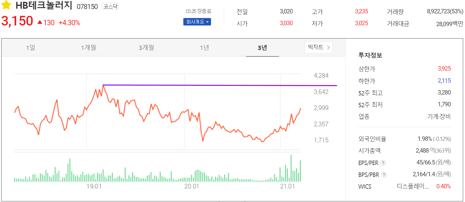 3월 25일 장종료 기준 당사의 주가는 3,150원으로 최근 가파른 상승을 보이고 있습니다. 외국인 비중은 1.98%이며, 시가총액 2,488억 원으로 코스닥 시총 상위 363위 종목입니다.