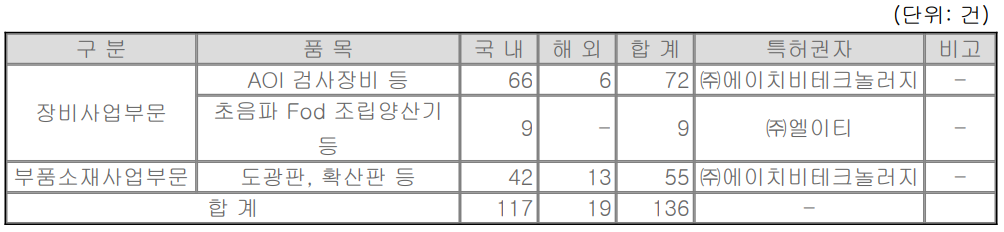 지속적인 연구개발의 결과로 장비 사업부문 75건, 부품 소재 사업부문 42건의 특허를 획득하면서 진입장벽을 구축하였고, 현재 국내 15건 해외 13건의 특허를 출원 중에 있습니다.