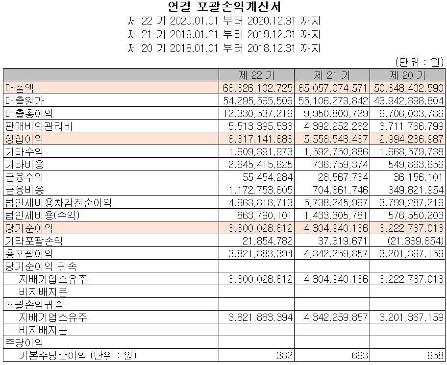 당사의 2020년 매출액은 666억 원으로 전년 대비 2.45% 증가했고, 영업이익은 68억 원으로 22.7% 증가, 당기순이익은 38억 원을 기록하면서 11.71% 감소했습니다. 코로나19 상황에서도 꾸준한 매출 성과를 달성했으며, 내부 비용 절감에 따른 영업이익도 증가하였으나, 환율 변동에 따른 외환차손에 의한 비용이 증가하면서 당기순이익은 감소하였습니다.