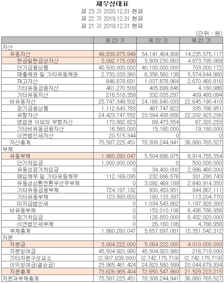 당기 말 유동 자산은 498억 원, 유동 부채는 19.6억 원을 기록하면서 유동비율은 2,542.51%를 기록했습니다. 부채 총계는 19.6억 원, 자기 자본은 736억 원으로 부채비율은 2.66%를 기록하면서 낮은 수준입니다.