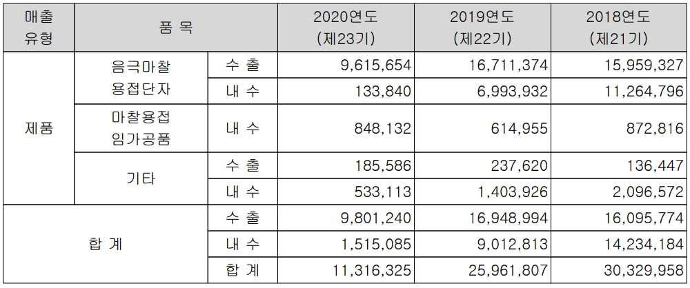 당사는 국내에 마찰용접기술을 최초로 도입하여 음극 마찰 용접단자 등 다양한 2차전지 관련 부품을 주 고객사인 삼성SDI를 통한 다양한 글로벌 완성차 업체에 공급하고 있습니다. 2020년에는 아쉽게도 주 고객사의 설계 변경으로 인한 부스바의 수요가 급감한 데 따라 대부분의 매출이 감소하였습니다. 당사의 주력 제품인 음극 마찰용접 단자는 전제 매출의 86.15%를 차지하였으며, 마찰용접임가공품이 7.56%로 그 뒤를 잇고 있습니다.
