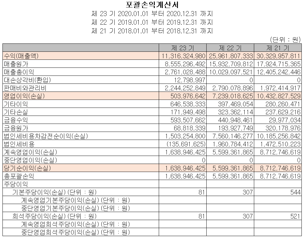 주력 제품인 부스바의 수요 급감에 따라 2020년 매출액은 113억 원으로 전기 대비 56.4% 감소했고, 영업이익은 5억 원으로 93% 감소, 당기순이익은 16억 원으로 71% 감소했습니다. 매출 악화로 인한 고정비 부담이 이익률 저하를 가져온 상황입니다.