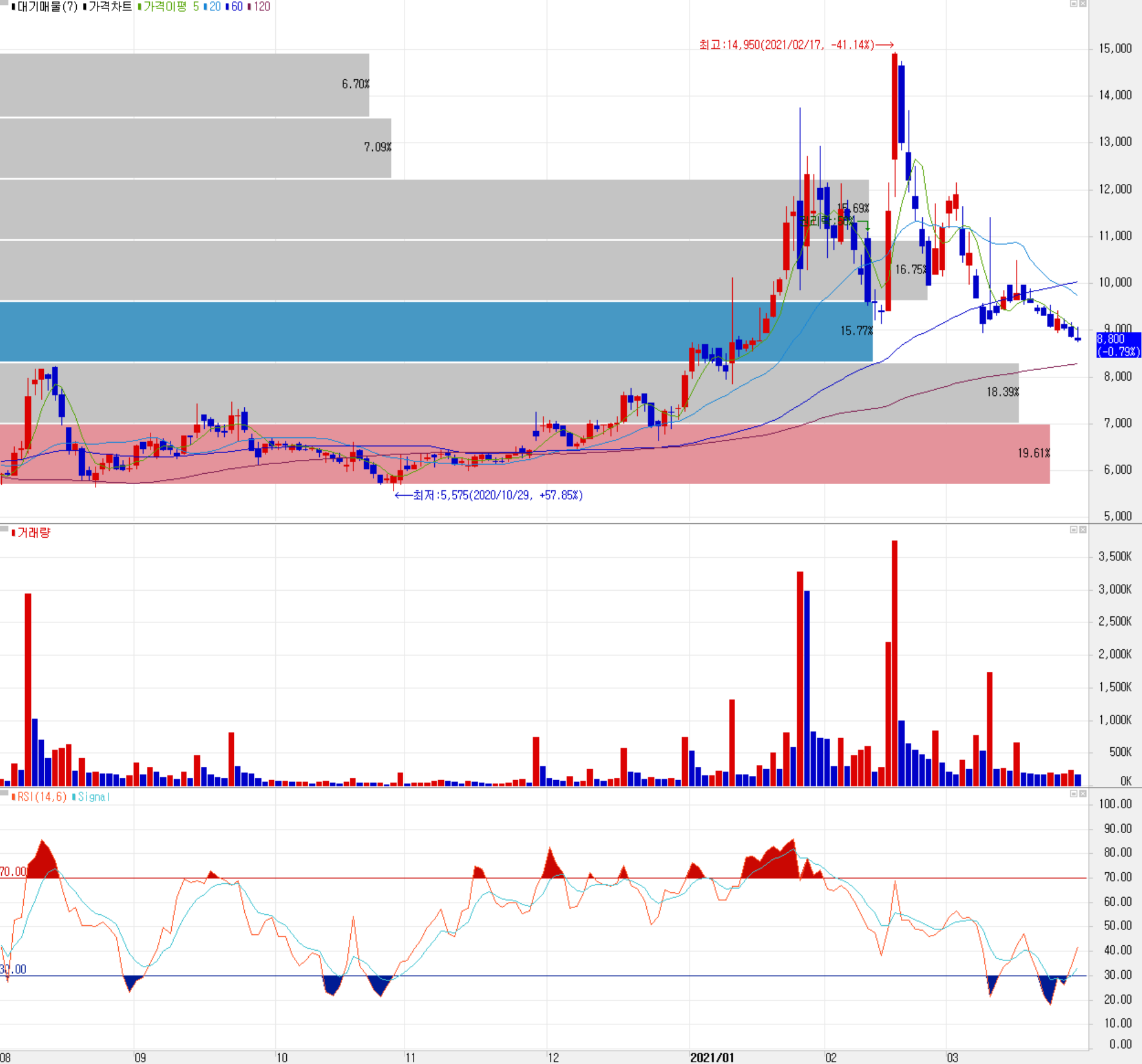 최근 한달간 수급에서는 개인의 매수 우위가 강한 가운데, 외국인과 기관은 매도세가 강한 모습입니다. 지난해 3월 코로나19 팬데믹으로 인한 급락 이후 주가는 빠르게 이전 수준을 회복했으나, 실적 부진으로 인해 한동안 횡보하는 모습을 보이다가 1월 들어 무상증자 소식이 나오면서 급등했습니다. 현재는 상승분을 반납하고 하락 추세를 보이고 있는 상황입니다. 지난 급등에 따른 매물은 어느 정도 소화된 것으로 판단되지만, 시장 변동성으로 큰 모멘텀 없이 단기적 상승은 어려운 국면입니다. 추가 하락 시 1차 지지는 8,300원 근처가 될 것 같고, 중장기적으로는 조만간 하락이든 상승이든 방향을 결정할 것으로 보입니다. 개인적으로 중장기적인 목표주가는 13,000원을 예상하고 있으나, 상승 시 9,800 선에서 1차 저항을 맞을 것으로 보며, 8,000원 하향 돌파 시 손절 예상입니다.
