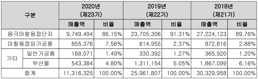 당사는 국내에 마찰용접기술을 최초로 도입하여 음극 마찰 용접단자 등 다양한 2차전지 관련 부품을 주 고객사인 삼성SDI를 통한 다양한 글로벌 완성차 업체에 공급하고 있습니다. 2020년에는 아쉽게도 주 고객사의 설계 변경으로 인한 부스바의 수요가 급감한 데 따라 대부분의 매출이 감소하였습니다. 당사의 주력 제품인 음극 마찰용접 단자는 전제 매출의 86.15%를 차지하였으며, 마찰용접임가공품이 7.56%로 그 뒤를 잇고 있습니다.