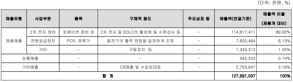 당사의 2020년 매출에는 주력 사업인 2차전지 후공정 장비 관련 매출이 전체 매출의 89.92%를 차지하였으며, PCR, 정류기 등 전원 공급장치가 6.13%로 그 뒤를 잇고 있습니다.