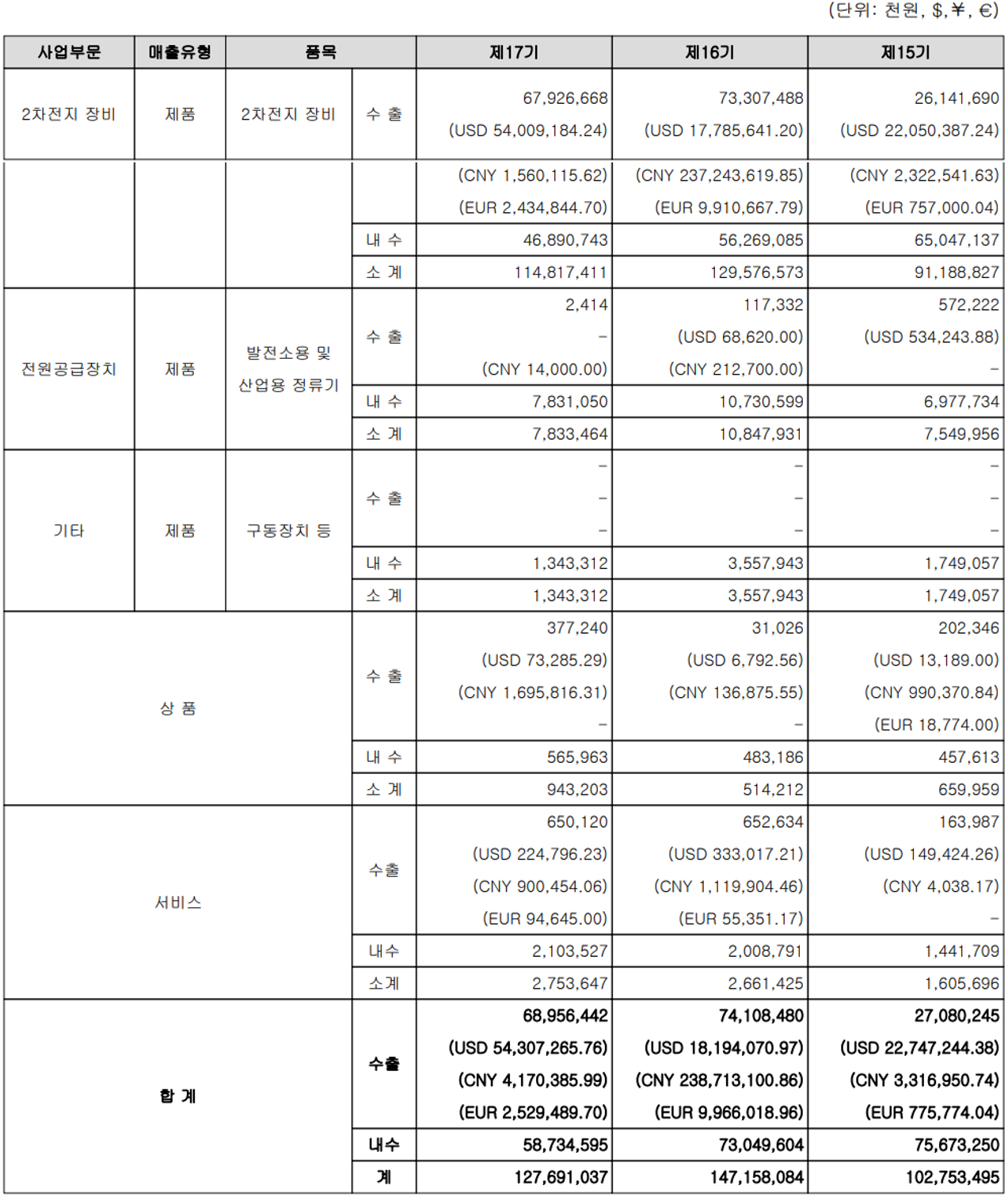 전반적으로 코로나19로 인해 수출과 내수 모두 실적이 감소했고, 전체 매출 중 수출은 54% 내수 46%의 비중을 보이고 있습니다. 주력 제품인 2차전지 장비의 경우 수출 비중이 59%를 차지하였습니다.