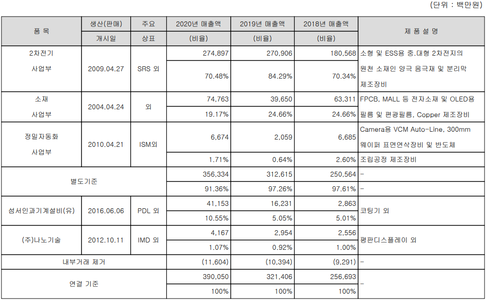피엔티의 사업 부문별 매출에서는 2차전지 공정용 제조장비의 매출이 70.48%, 동박, 필름 제조장비를 수행하는 소재 사업부의 매출이 19.17% 그리고 정밀자동화 사업부의 매출이 1.71%를 차지하고 있습니다.