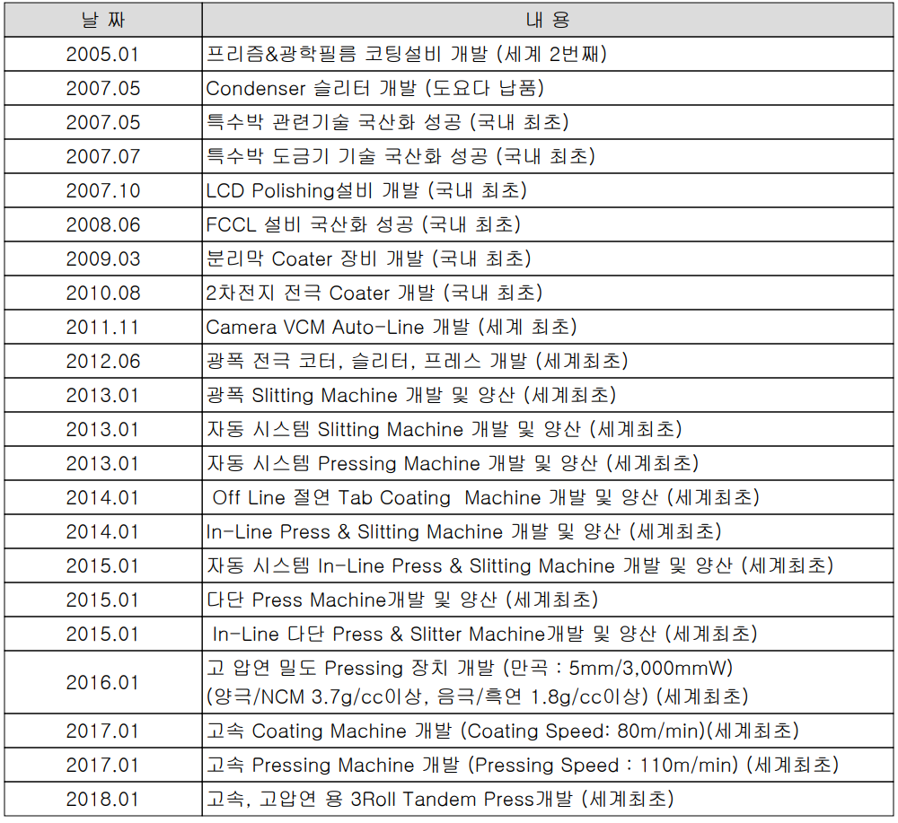 당사는 독보적인 롤투롤 컨버팅 제조 기술 기반으로 지난 2005년 부터 필름, 동박 관련 제조 기술 및 2차전지 코터, 슬리터, 프레스 그리고 세계에서 경쟁상대가 없는 카메라 모듈의 VCM 자동화 생산 장비 등 정밀 자동화 시스템 분야까지 다양한 제품을 국내 최초 및 세계 최초로 개발하여 국산화하는데 기여하였습니다.