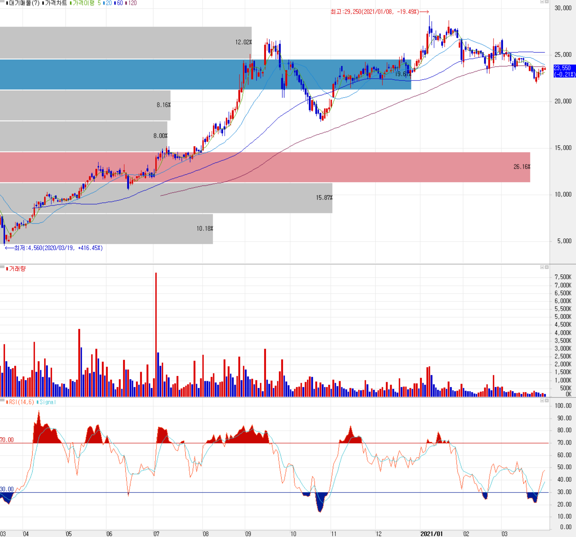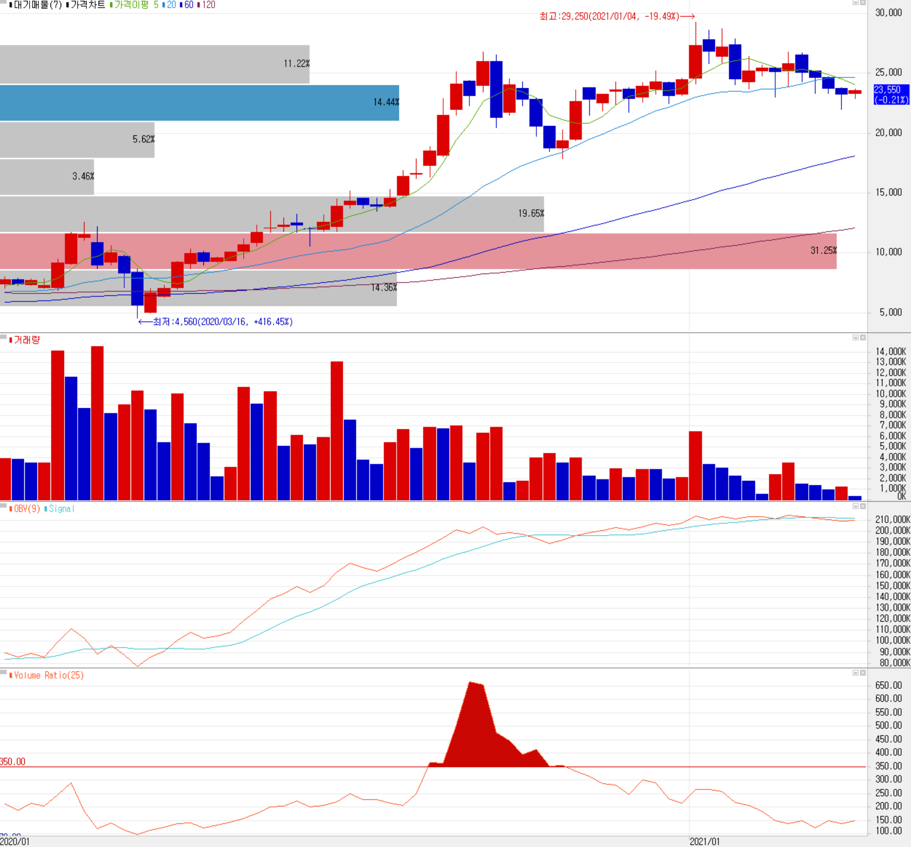 당사의 주가는 지난 2020년 3월 코로나19 팬데믹으로 인한 급락 이후 빠르게 주가를 회복하면서 그린 뉴딜 정책 등으로 전기차용 2차전지 장비 대장주로서 꾸준한 우상향을 보였습니다. 시장 수급으로 반도체 등으로 바통이 넘어가면서 일시 조정을 겪은 후 다시 상승하면서 지난 1월 초에는 최고가인 29,250원을 터치했고 최근까지 하락세를 보이고 있습니다. 수급에서는 개인의 매수 우위 가운데, 금융투자가 7 거래일 연속 매수 중이지만 거래량이 많지 않습니다. 지난 급등에 따른 부담과, 2차전지 전반적인 모멘텀 둔화 그리고 시장 전반의 조정과 함께 방향성을 보여주지 못하고 있습니다. 개인적으로 목표주가는 35,000원으로 설정하였고, 21,000원 손절가로 예상하고 접근할 계획입니다.