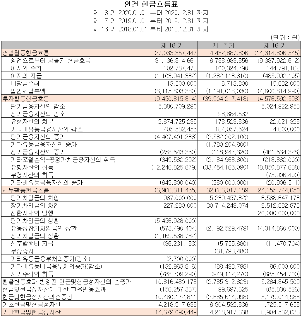 양호한 실적을 바탕으로 영업활동을 통해 현금을 창출하고 있으며, 이에 따른 투자 활동도 수행하고 있습니다. 또한 차입금 등 부채의 상환과 배당금의 지급 등도 원활하게 이루어지고 있습니다.