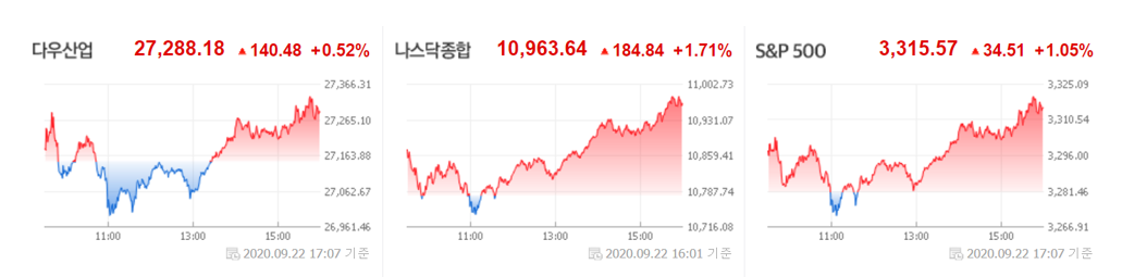 지난 밤 뉴욕 증시는 주요 기술주의 상승 영향으로 나스닥은 184.84포인트(1.71%) 오른 10,963.64로 마감했습니다. 다우산업과 S&P500 지수도 각각 0.52%, 1.05% 동반 상승하면서 장을 마쳤습니다. 미국 증시도 장 초반에는 하락세를 보이다가 파월 연준 의장의 하원 금융서비스 위원회에서 '경기회복에 필요하다면 추가 양할 것'을 시사하면서 증시가 상승 반전하기 시작했습니다. 테슬라 배터리데이를 통해 배터리 내재화나 전고체 배터리 등 혁신적인 내용을 기대했던 투자자들의 실망감에 낙폭을 키우고 있습니다. 하지만 일론 머스크는 향후 25,000 달러 짜리 전기차를 만들겠다고 발표하면서 전기차의 대중화를 기대하게 했습니다.