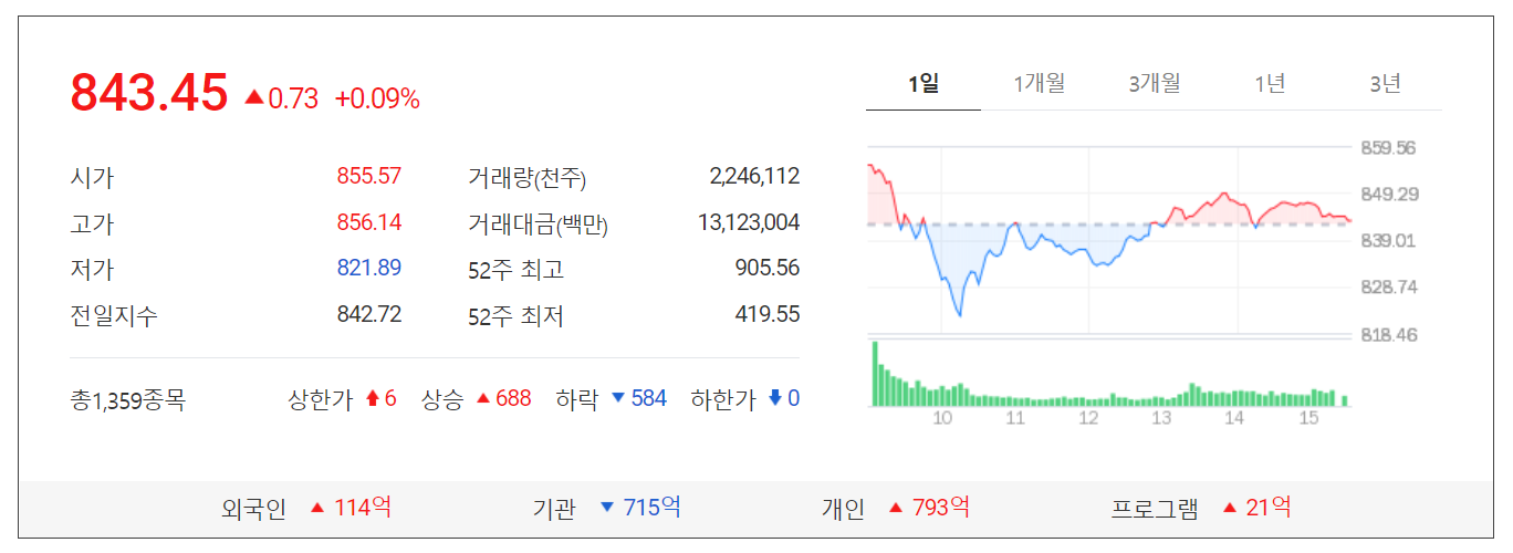 오늘 코스닥 시장은 전일 대비 0.73포인트(0.09%)올라 843.45에 마감했습니다. 코스닥 역시 855.57로 상승 출발하였으나, 장 초반 하락하다가 오후 들어 상승 반전하면서 강보합을 보이면서 끝났습니다. 기관이 715억 원어치 팔아치우는 와중에 외국인이 114억 개인이 793억 순매수하면서 장을 이끌었습니다.