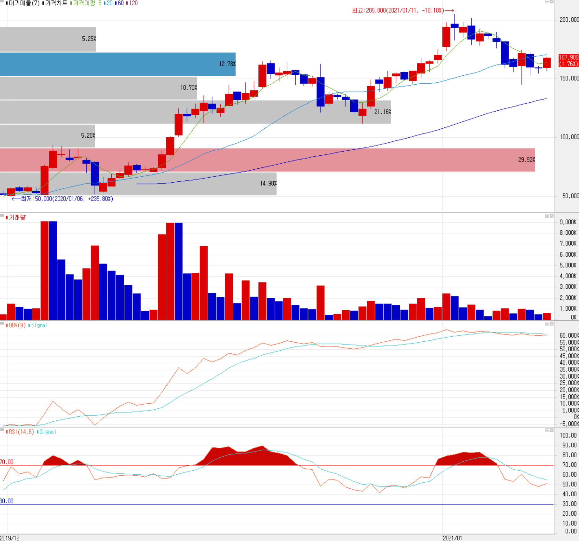 지난해 3월 코로나10 팬데믹으로 인한 급락 이후 빠르게 회복한 당사의 주가는 올해 1월까지 꾸준한 상승 곡선을 그리다가 시장의 조정과 함께 급등 주들의 하락이 왔습니다. 또한 테슬라와 폭스바겐 등 글로벌 완성차 업체들의 내재화 선언 등에 따른 하락도 있었으나, 단기적으로 큰 영향은 없을 것으로 판단됩니다. 아무튼 최근 당사의 주가는 반등을 시도하면서 조만간 방향성을 확실하게 보여줄 듯한 모습입니다. 최근 한 달간 수급에서는 기관과 외국인의 매물을 개인이 주로 받아내는 상황이 계속되고 있습니다. 투자 포인트 및 기술적으로 볼 때 조정 시 159,000원을 1차 지지로 보고 있으며, 상승 시 181,000원에서 저항을 예상하고 개인적 목표주가는 210,000원으로 설정했습니다.