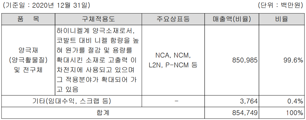 당사는 주력 제품인 하이니켈 계열 NCA와 Advanced NCM 계열은 최근 시장의 요구에 부합되는 제품으로 점차 매출이 확대되고 있습니다. 당사는 니켈 함량 고도화를 넘어 단결정 소재, 전고체 전지 등 차세대 전지를 위한 연구개발을 지속하고 있습니다.