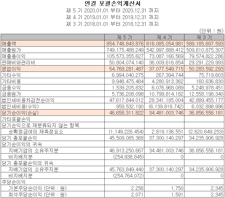 당사의 2020년 실적은 매출액 8,47억 원으로 전년 대비 38.7% 증가했고, 영업이익은 47.7% 증가한 548억 원, 당기순이익은 35.3% 증가한 466억 원을 기록했습니다. 지난해 코로나19의 어려운 상황 속에서도 매출이 크게 증가하였고, 환율 변동과 원자재 가격의 변동성으로 이익에 대한 우려가 있었으나 제조원가 개선, 판관비 절감 등 자체적인 노력을 통해 높은 이익률을 달성하였습니다.