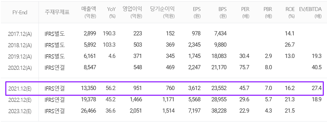 당사의 2021년 컨센서스는 매출액 1조 3,350억 원으로 전년 대비 56.2 증가하고, 영업이익은 951억 원을 기록하면서 73.5% 증가할 것으로 추정했습니다.