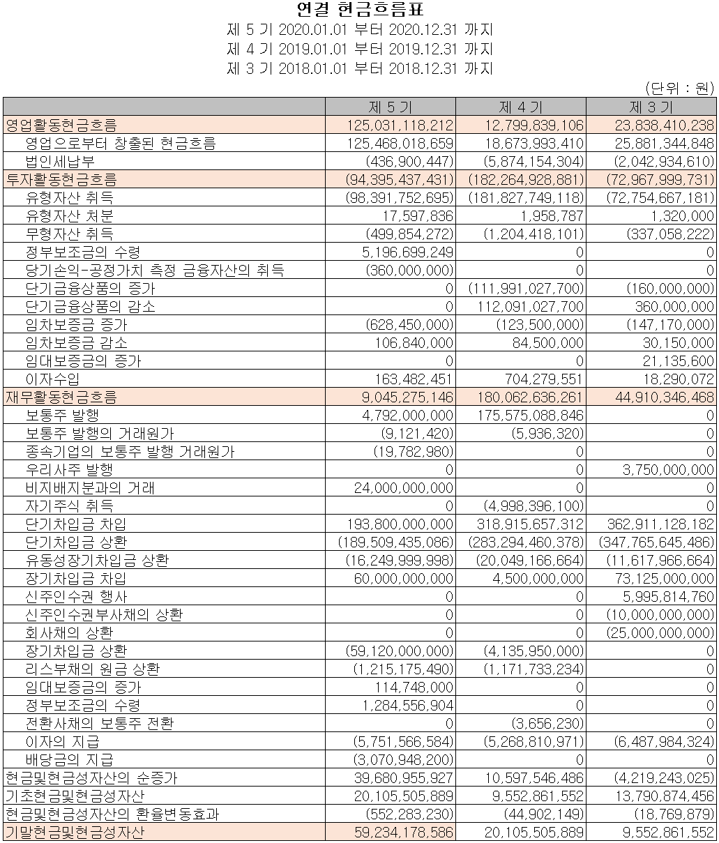 최근 3년간 영업활동으로 인한 현금이 창출되고 있으며, 장단기 차입금을 통한 투자활동이 이루어지고 있습니다. 2020년 기말 기준 현금성 자산은 592억 원입니다.