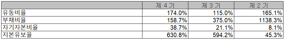 유동비율 174%, 부채비율은 158.7%, 자기자본비율 38.7%, 자본유보율은 630.8% 기록하고 있으며, 성장 기업으로서 자본의 규모가 커지면서 부채 비율은 감소하고 유보율은 증가하는 등 전반적으로 양호한 흐름의 재무 상태를 보이고 있습니다.
