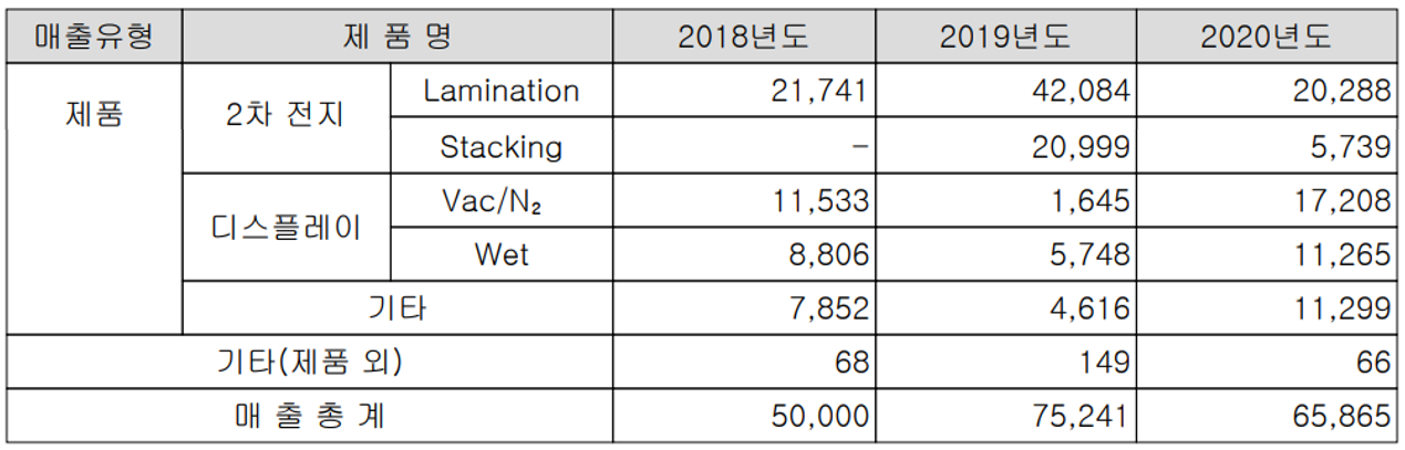 2차전지의 라미네이션과 스태킹 장비는 모두 전방 산업의 설비 지연 등으로 매출이 감소했고, 디스플레이 장비의 경우 전년 대비 366.7%가 증가하였습니다.