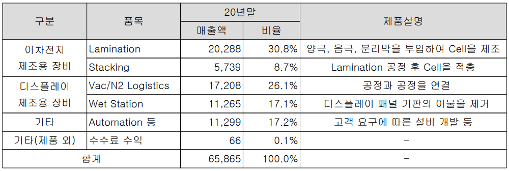 당사는 2차전지, 디스플레이 제조용 장비를 주력을 생산하는 기업으로서, 지난 2020년 2차전지 제조용 장비의 매출은 39.5%, 디스플레이 제조용 장비는 43.2%의 매출 비중을 기록했습니다.
