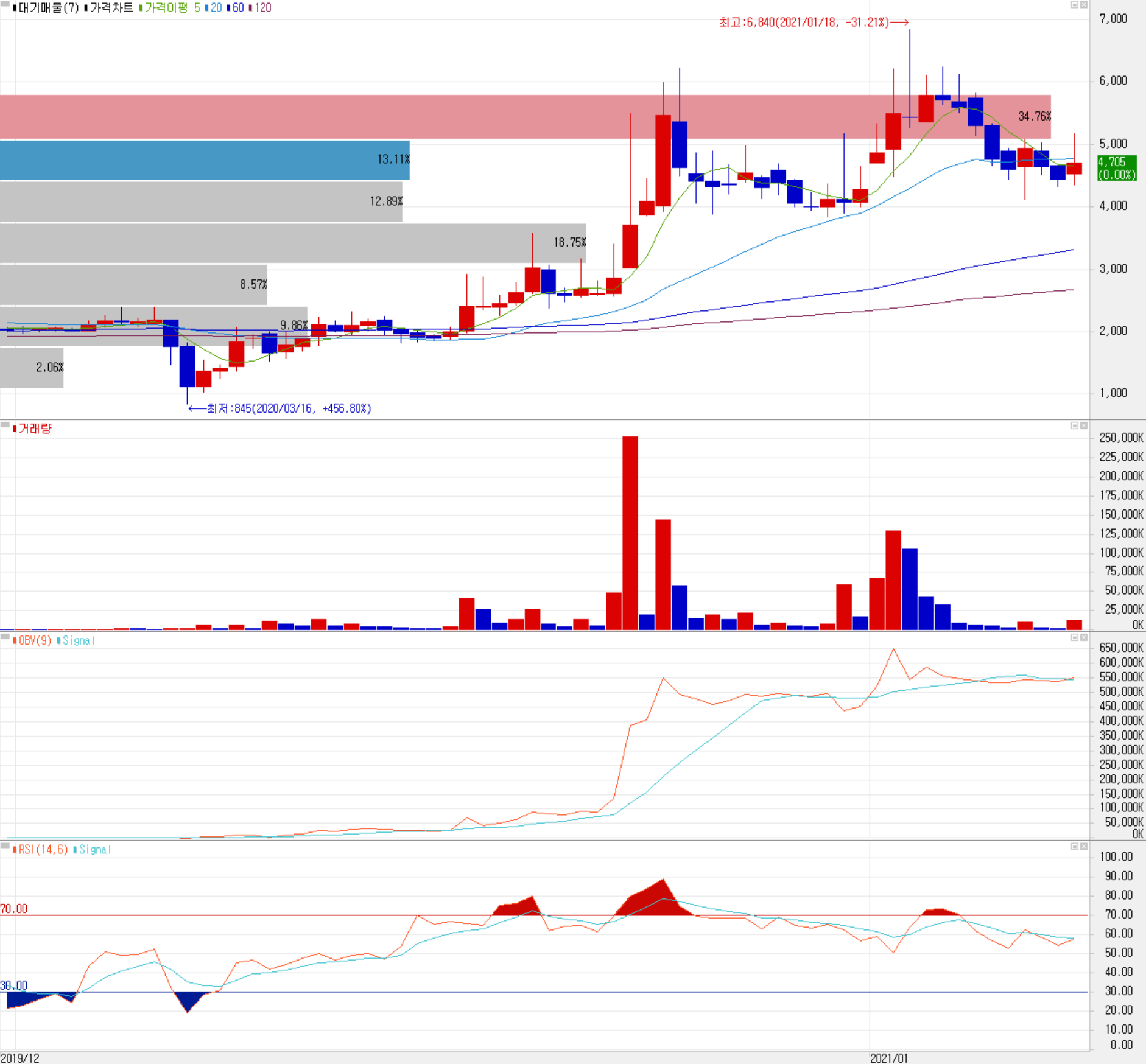 당사의 주가도 지난해 3월 코로나19 팬데믹으로 급락한 후 바르게 회복하면서 두 차례 가파른 상승을 이어갔습니다. 지난해 10월에는 테슬라가 주요 거래처 중 한 곳인 LG화학 등으로부터 더 많은 배터리를 받을 계획이라고 밝히면서 관련주가 급등했었고, 연초에는 배터리 제조사들의 CAPA 확대에 따른 수혜가 예상되었고, 애플 카 테마 등이 있었습니다. 최근 2월 들어서면서 시장의 수급 이슈와 글로벌 완성차 업체들의 내재화 발언 등과 함께 조정을 겪고 있으나 반등을 시도하고 있는 형국입니다.  최근 한 달간 수급에서는 외국인의 매수 우위 가운데, 기관의 수급이 현저하게 줄어든 모습입니다. 당사의 2차전지 주력 제조 장비를 LG에너지솔루션에 독점 공급하는 점 등 투자 포인트와 기술적 분석을 토대로 개인적인 중장기 목표주가는 7,100원으로 설정하였고, 조정 시 4,300원을 지지로 상승 시 5,300원 부근에서 1차 저항이 예상됩니다.