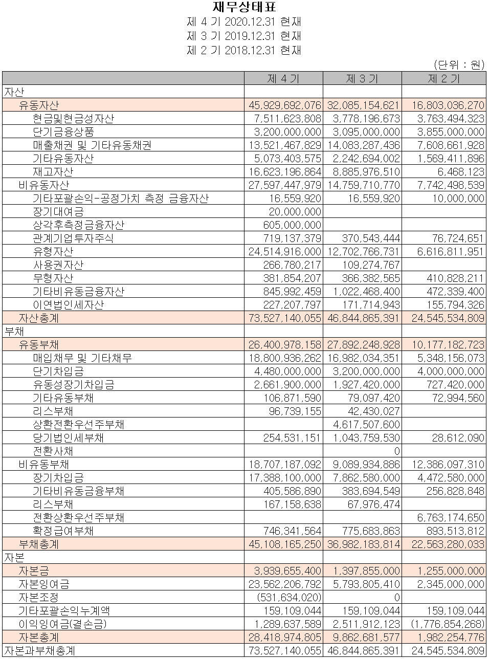 2020년 자산은 전년 대비 267억 원(57%)이 증가하면서 735억 2,714만 원입니다. 자산의 증가는 주로 생산설비 증축에 따른 비용(97억 8천만 원)으로 유형자산이 증가하였고, 재고 자산의 증가로 인해 유동 자산이 증가하였습니다. 부채는 장단기 차입금의 증가로 전년 대비 22% 증가한 451억 원을 기록했습니다.