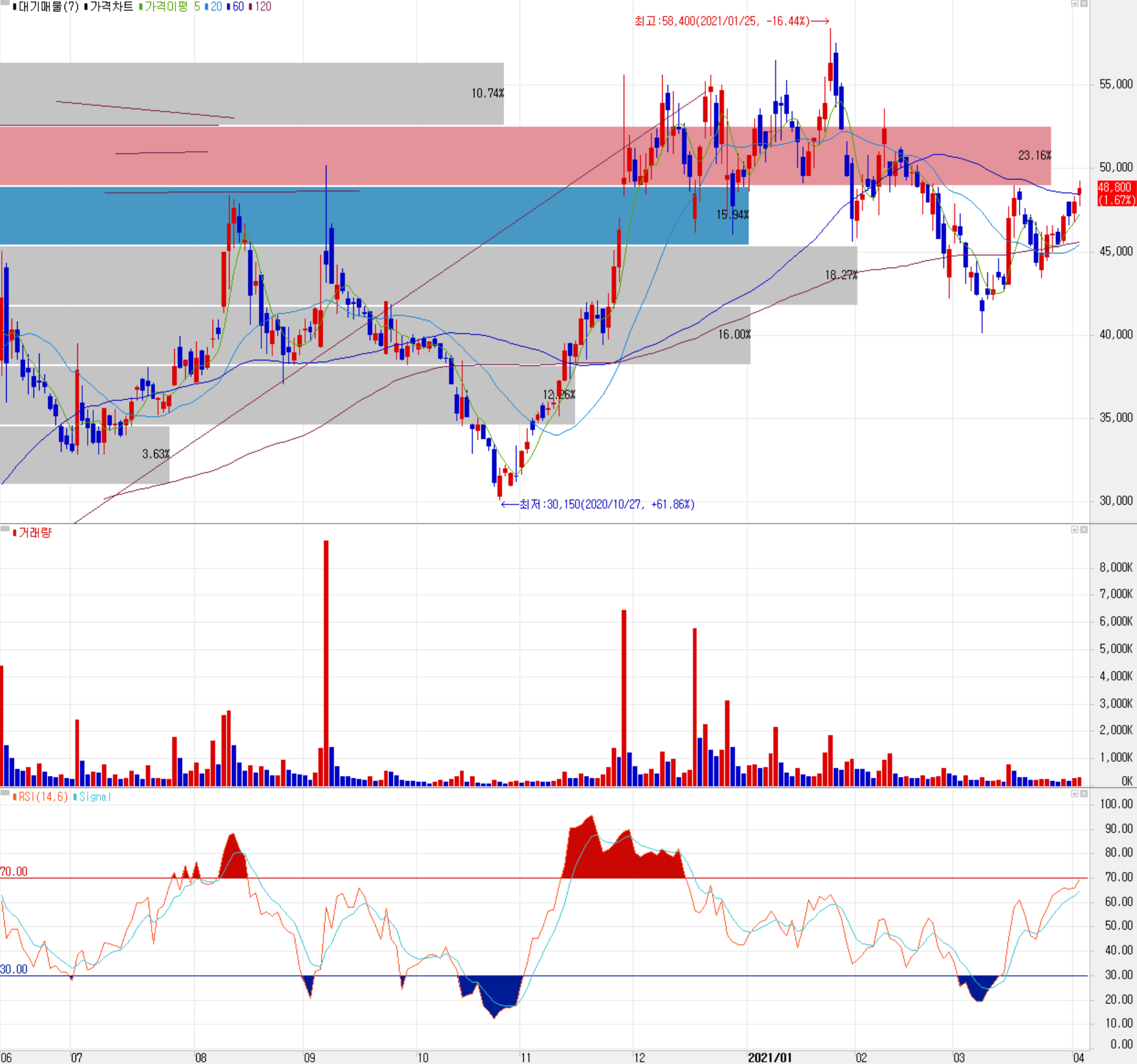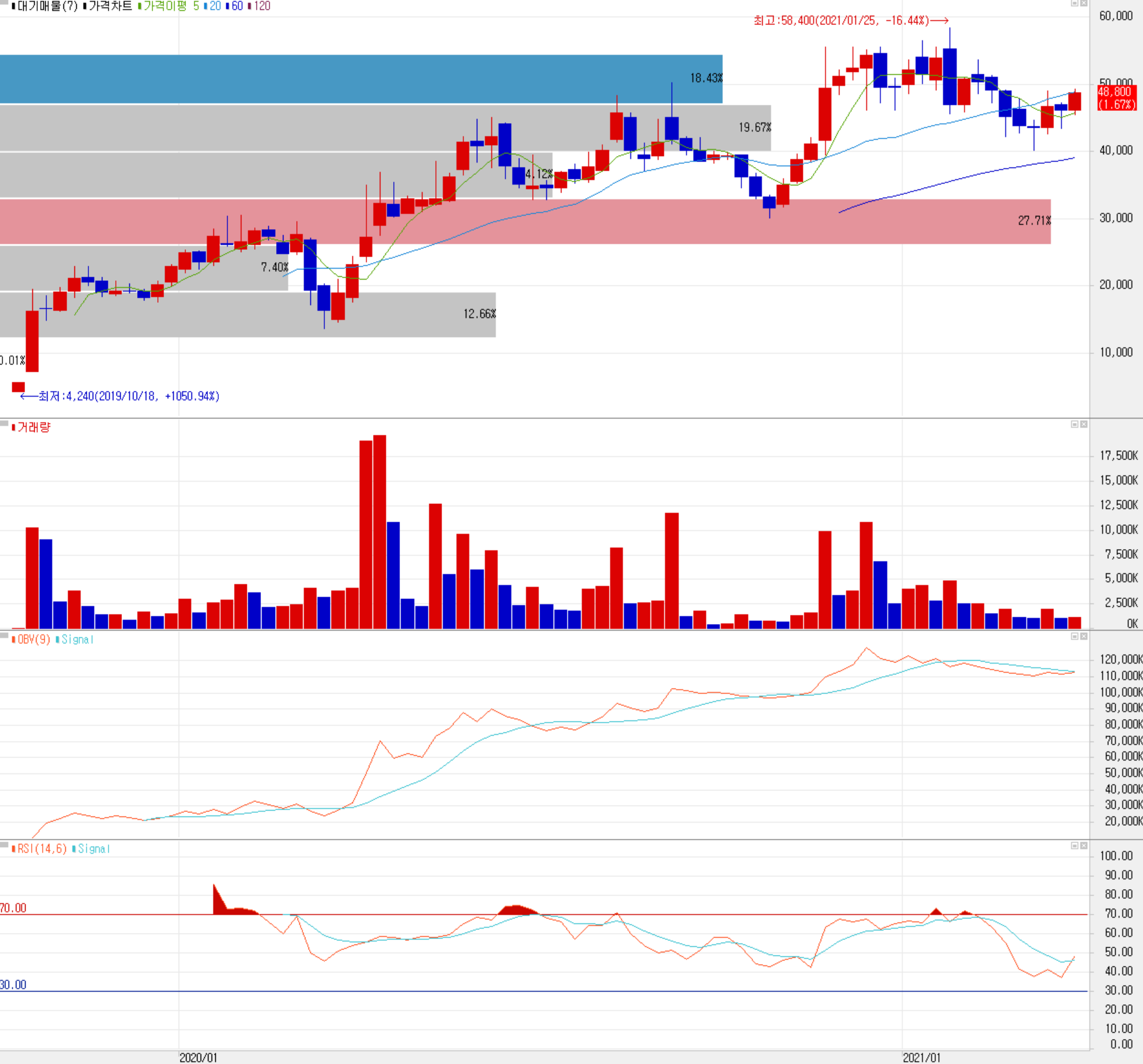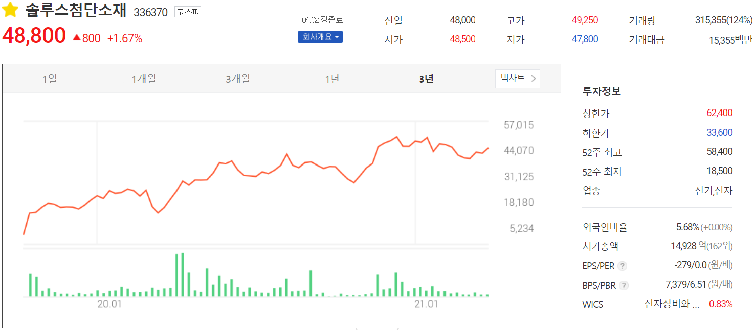 사실상 솔루스첨단소재로서의 원년인 2020년 당사의 주가는 10월 들어서 정부 주도의 BBIG에 대한 시장 조정에 따른 하락이 있었지만 일본 제품이 독점하던 초극박 동박 시장의 진출 및 유럽 유일의 헝가리 전지박 제조공장의 완공 등을 눈앞에 두고 내재적 가치는 충분했습니다. 지난 1월 초에는 LG에너지솔루션에 전지박 공급을 시작한다는 소식에 상승하면서, 1월 25일 최고가인 58,400원을 터치했으나, 시장 기대치를 하회하는 4분기 실적과 시장의 수급 변동으로 인해 다시 한번 조정을 겼다가 최근 반등 흐름을 보여주고 있습니다. 최근 수급에서는 기관이 8 거래일 연속 순매수를 이어가고 있으며, 외국인과 개인은 매도 우위를 보이고 있습니다. 기술적으로는 조정 시 44,000원, 41,000원에서 각각 지지할 것으로 보고 있으며, 개인적인 목표 주가는 62,000원으로 54,000원 근처에서 저항이 예상됩니다. 당사는 2021년 들어서도 중국 OLED 공장 착공, 헝가리 공장 추가 증설 등 공격적인 투자를 진행하고 있어 미래가 기대되는 종목이지만, 1분기 매출 실적의 변화와 비용 조달에 따른 채무 등도 함께 지켜보면서 분기별로 주가를 재검토하는 것이 적절하다고 생각합니다.