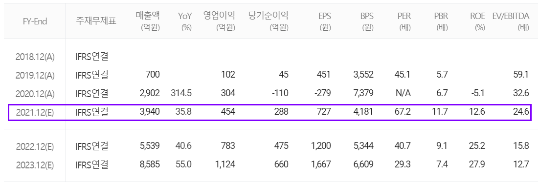 당사의 2021년 컨센서스는 매출액 3,940억 원으로 전년 대비 35.8% 증가하고, 영업이익은 454억 원으로 49.3% 증가, 당기순이익은 288억 원을 기록하면서 흑자 전환을 추정했습니다. 중국 내 5G 투자 개시에 따른 부분과 헝가리 전지박 공장 설비 완료에 따른 매출 증대가 주요 성장 항목으로 평가된 것 같습니다.