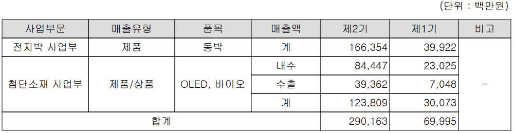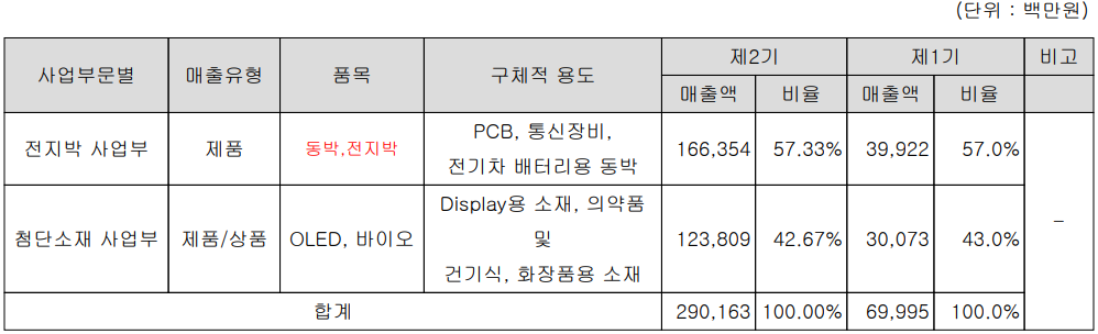 당사의 사업부문은 크게 동박, 전지박을 생산하는 전지박 사업부와 OLED, 바이오 소재를 제조하는 첨단소재 사업부문으로 구분됩니다. 지난 2020년 전지박 사업부문의 매출은 1,664억 원으로 전체 57.33%의 비중을 차지했습니다. 동박 사업은 주로 5G 장비 및 반도체용 고품질 동박을 양산하고, 전지박 사업은 2차전지용 동박을 양산하기 위해 지난 2018년 설립을 결정하여 2020년 4분기부터 양산에 돌입하였습니다.