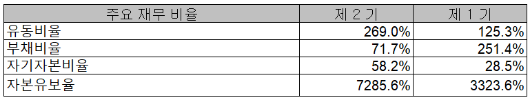 당사의 2020년 유동 비율은 269%, 부채비율 71.7%, 자기 자본비율 58.2% 및 자본 유보율은 7,285.6%를 기록하면서 전반적인 재무상태는 전기 대비 양호한 흐름으로 유지되고 있습니다. 대규모 시설 투자가 완료된 헝가리 공장의 실적과 공격적인 추가 증설에 따른 자금 등을 지속적으로 살펴볼 필요가 있습니다.