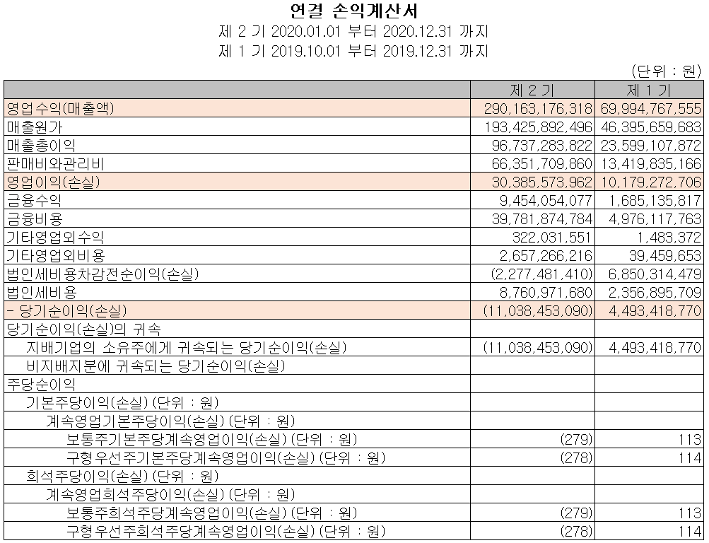 당사의 2020년 실적은 매출액 2,902억 원, 영업이익 304억 원을 기록하였으나 환율변동으로 인한 환차손 증가로 손실이 발생하면서 당기순손실을 기록했습니다. 4분기 매출액은 701억 원으로 전년 동기 대비 동등 규모의 실적을 나타내면서 시장의 기대치를 하회하였습니다. 주된 요인은 코로나19로 인한 중국 내 5G 투자 지연과, 헝가리 전지박 공장의 매출이 예상보단 부진한 결과였습니다. 하지만 최근 LG에너지솔루션과 공급 계약이 개시되면서 유럽지역에 4천2백억 원 규모의 전지박을 납품할 예정입니다.