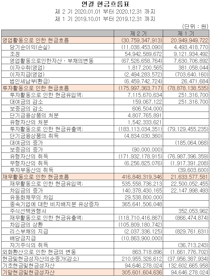 2차전지 관련 산업 성장에 대응하기 위한 투자활동이 이어지고 있으며, 영업활동으로 인해 부족한 자금은 장단기 차입금과 증자 등으로 조달하고 있습니다. 2020년 당기 말 기준 현금성 자산은 3,056억 원입니다.