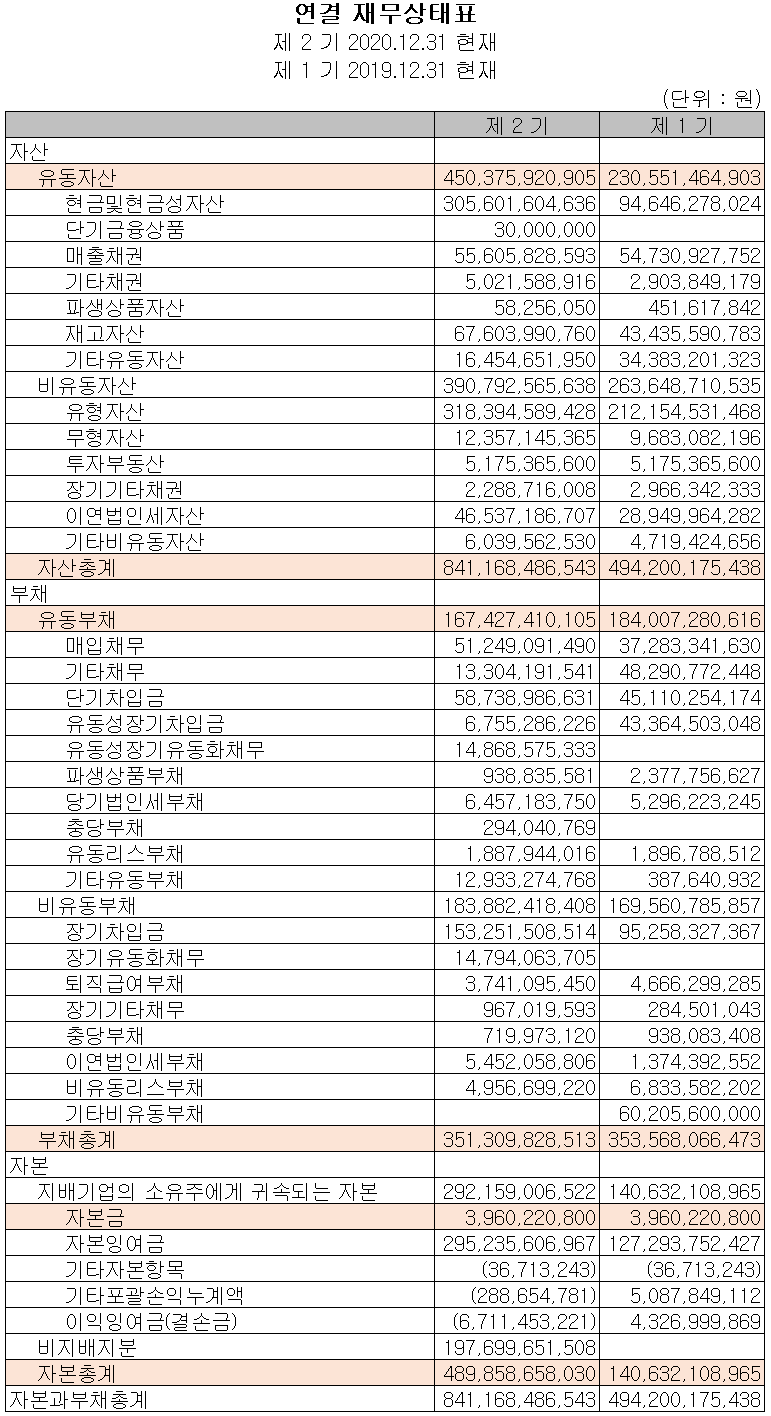 당사의 2020년 유동 비율은 269%, 부채비율 71.7%, 자기 자본비율 58.2% 및 자본 유보율은 7,285.6%를 기록하면서 전반적인 재무상태는 전기 대비 양호한 흐름으로 유지되고 있습니다. 대규모 시설 투자가 완료된 헝가리 공장의 실적과 공격적인 추가 증설에 따른 자금 등을 지속적으로 살펴볼 필요가 있습니다.