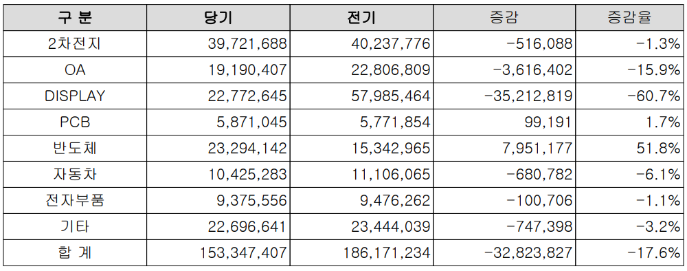 당사는 2차전지, 디스플레이, 반도체 및 자동차 등 다양한 산업의 제품 군으로 구분되어 있습니다.