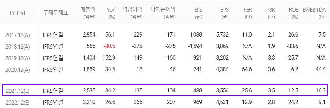2021년 당사의 컨센서스는 매출액 2,535억 원으로 전년 대비 34.2% 증가하고, 영업이익은 135억 원으로 650% 증가, 당기순이익은 104억 원으로 전년 대비 126% 증가할 것으로 추정했습니다.