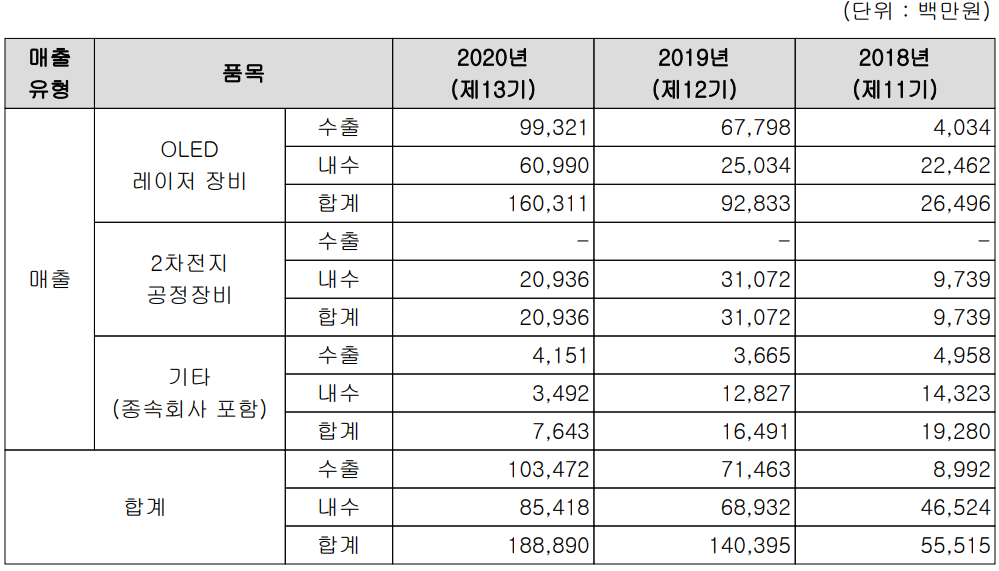 당사의 주력 제품인 OLED 레이저 장비의 수출은 62%, 내수가 38%의 비중을 보였고, 2차전지 공정 장비는 수출 실적이 없습니다. OLED 레이저 장비의 매출은 전년 대비 수출과 내수 모든 부분에서 증가하였으나, 2차전지 공정 장비의 경우 전년 대비 32.6% 감소한 209억 원을 기록했습니다. 하지만 수주잔고가 2020년 당기 말 기준 1,445억 원을 기록하면서 2021년 실적이 기대됩니다.