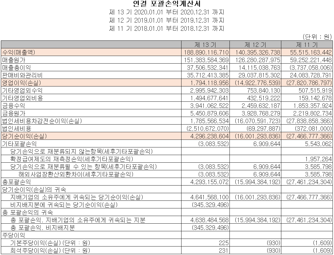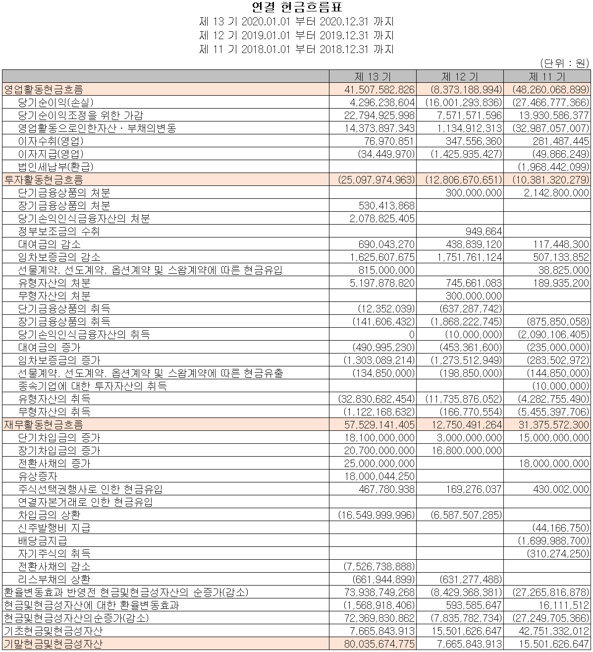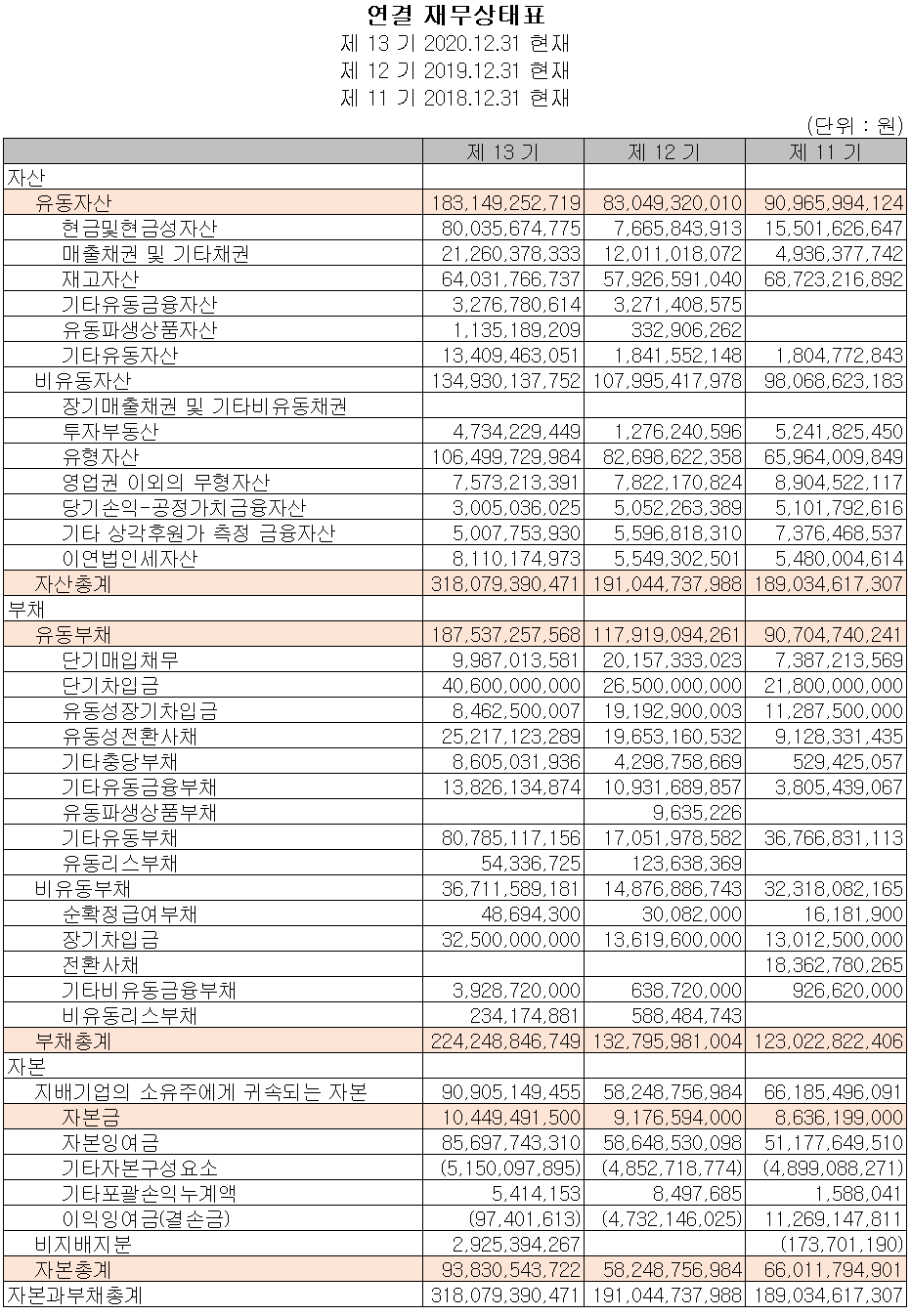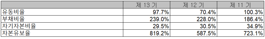 유동비율 97.7%, 부채비율 239%, 자기자본비율 29.5%, 자본 유보율 819.2%로 전반적으로 볼 때 부채가 크게 증가한 점의 개선이 필요하지만, 당사의 유동성 자금은 1,191억 원 규모, 현금성 자산이 800억 원으로 성장기업으로서 재무적 상태가 나쁜 편은 아니며, 2021년부터는 수익성이 개선되면서 재무 흐름도 더 좋아질 것을 예상됩니다.