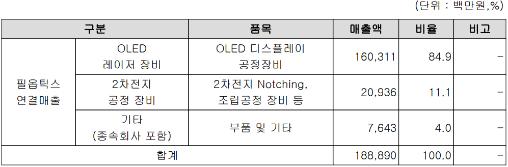 당사의 사업 부문은 디스플레이 제조용 장비와 2차전지 공정 용 장비 사업 부문으로 구분됩니다. OLED 디스플레이 공정 장비의 매출은 전체 매출의 84.9%를 차지했고, 2차전지 사업부문 매출은 11.1%의 비중을 보였습니다.
