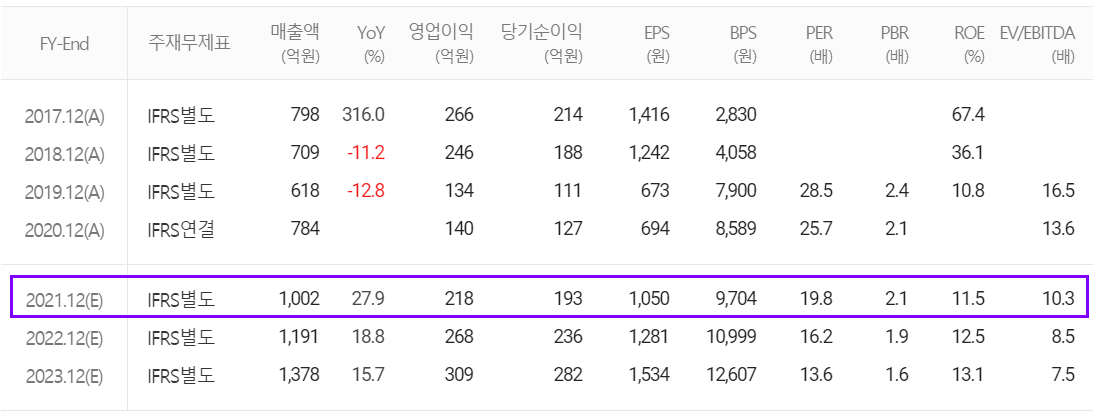 당사의 2021년 컨센서스는 매출액 1,002억 원으로 전년 대비 27.9% 증가하고, 영업이익은 193억 원으로 55.7% 증가, 당기순이익은 193억 원을 기록하면서 52% 증가할 것으로 추정했습니다. 반도체 및 디스플레이 산업의 호조와 2차전지 전해액 첨가제 및 PI모노머 등 신규 매출 발생 전망에 따라 성장을 예상한 것 같습니다.