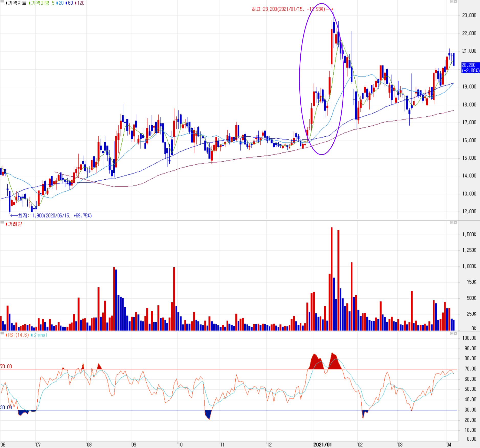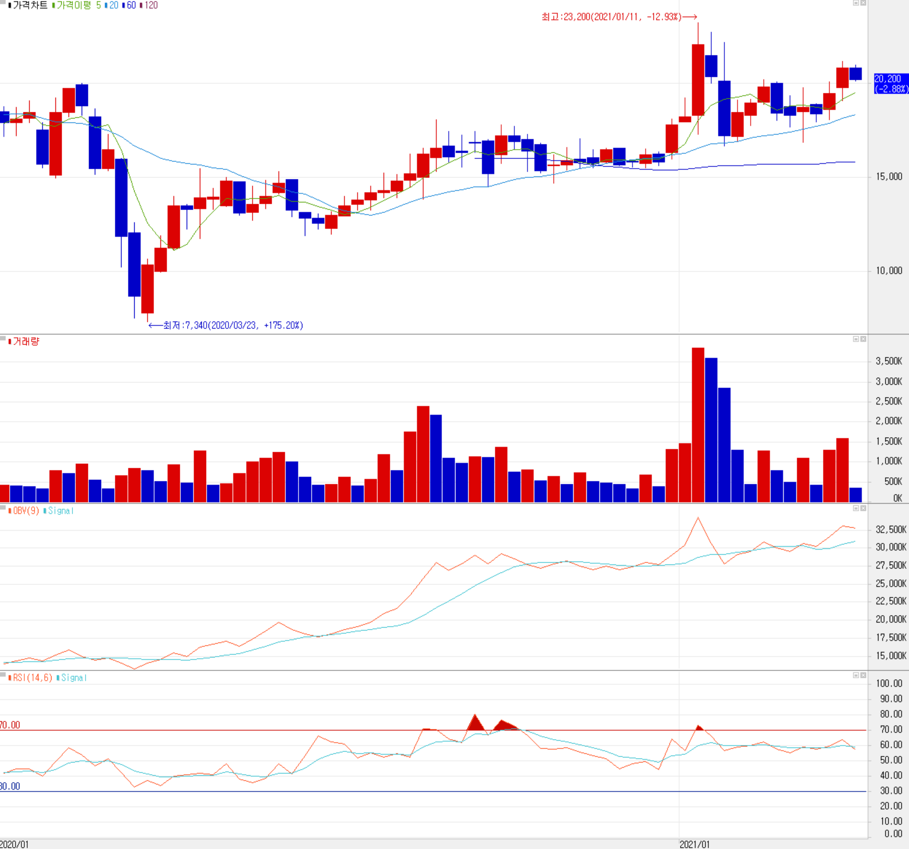 당사의 주가는 코로나19 팬데믹으로 인한 급락 이후 빠르게 회복했으나, 지난해 연말까지 박스권 횡보하는 모습을 보이다 크게 시세를 분출했습니다. 지난 연말연시 중 급등한 이유는 2차전지 전해액 첨가제와 PI 모노머 등 2~3가지의 소재를 개발하여 하반기 중 공급이 가능할 것이라는 소식 때문입니다. 하지만 대부분의 상승을 되돌린 후 등락을 반복하다가 2020년 실적 발표 시기와 함께 NAND Flash, OLED 성장 모멘텀으로 상승추세를 이어가고 있습니다. 최근 수급에서는 금융투자가 4 거래일 연속 순매수하는 등 기관계의 매수 우위 가운데 개인과 외국인은 매도 우위를 유지하고 있습니다. 컨센서스와 기술적 관점에서 개인적으로 목표주가는 23,500원에 설정하였으며, 추가 조정 시 19,200원 선을 지지로, 상승 시 21,900원 부근에서 저항이 예상됩니다.