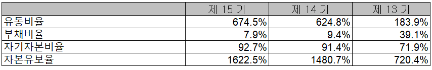 유동비율 674.5%, 부채비율 7.9%, 자기자본비율 92.7%, 자본 유보율은 1,622.5%를 기록하면서 안정적인 재무상태를 유지하는 것을 판단됩니다.