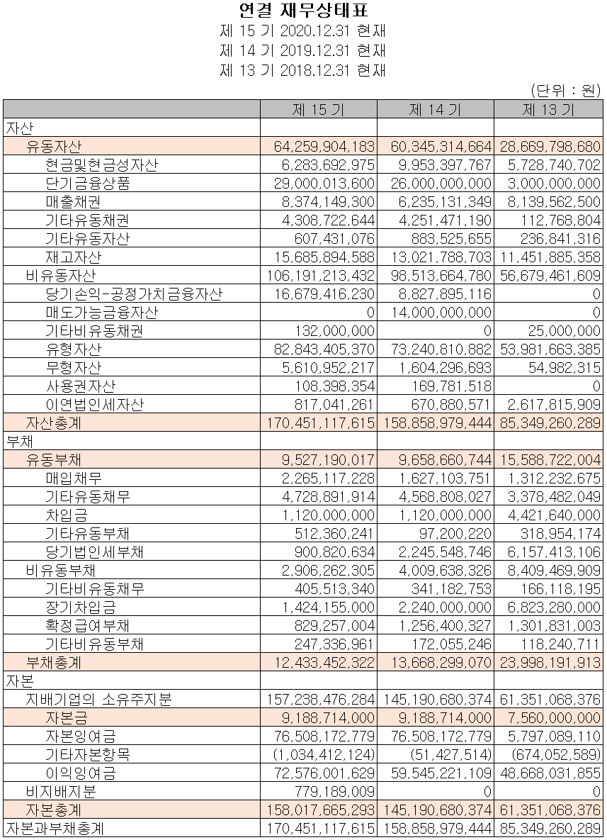 2020년 당기 말 기준 당사의 자산 총계는 전년 대비 7.3% 증가한 1,704억 원입니다. 유동 자산에서는 현금성 자산의 감소와 매출 채권의 증가가 있었고, 설비투자로 인한 유형자산의 증가가 전체 자산의 증가에 영향을 미쳤습니다. 부채는 전년 대비 9.0% 감소한 124억 원으로 주로 장기차입금 상환으로 인해 부채가 감소하였습니다.