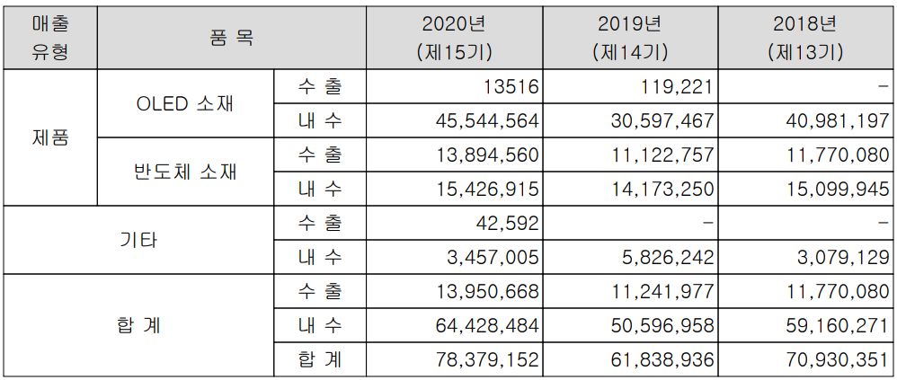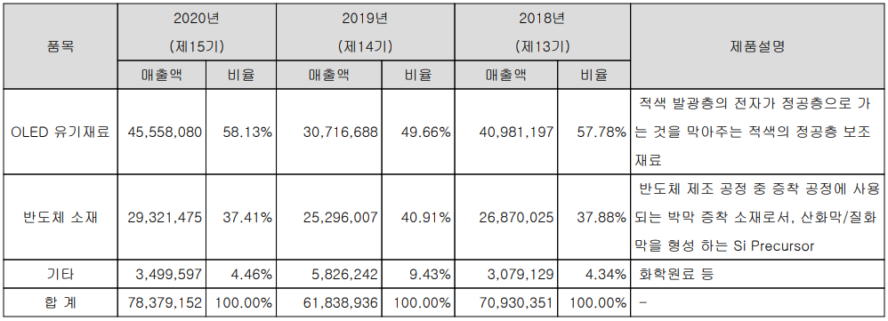 당사의 사업부문은 크게 OLED 유기재료 제품을 제조하는 디스플레이 사업 부문, 반도체 증착 소재인 프리커서 등을 제조하는 반도체 사업부문, 그리고 기타 화학원료의 제조 및 공급을 하는 사업부문으로 구분되어있습니다. 2020년 당사의 전체 매출 중 디스플레이 사업부문 매출은 57.78%, 반도체 사업 부문 매출은 37.88%의 비중을 나타냈습니다.